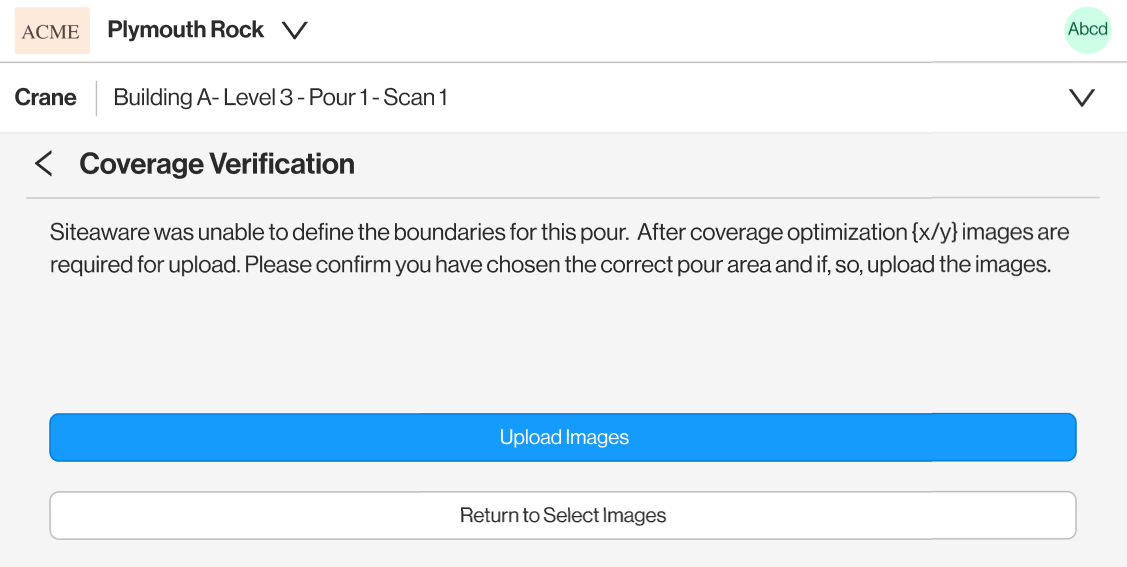 If you accidentally chose the wrong pour area for uploading, you may see the following screen instead of the coverage map. This indicates that you may be uploading to the wrong pour area. Please double check and if confirmed, proceed with the data upload.