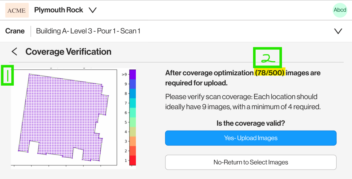 The verification process filters the data to provide the optimal coverage of the images captured significantly reducing the number of images required for upload. It also returns a coverage map, indicating if each portion of the deck was properly captured and can be processed for verification.