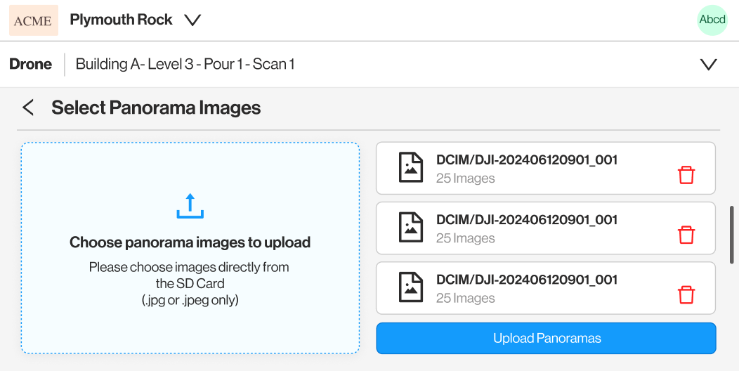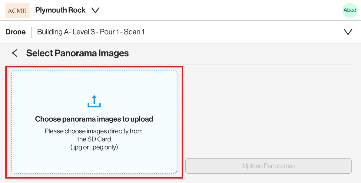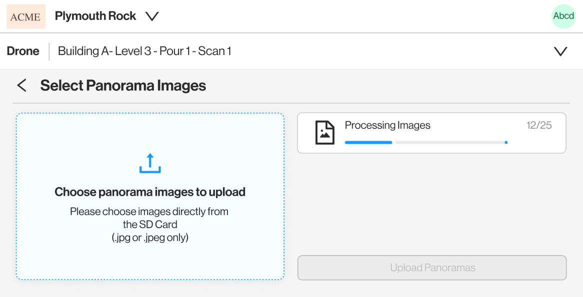 - Select Choose Panorama Images to Upload and select the images from the first panorama to be uploaded