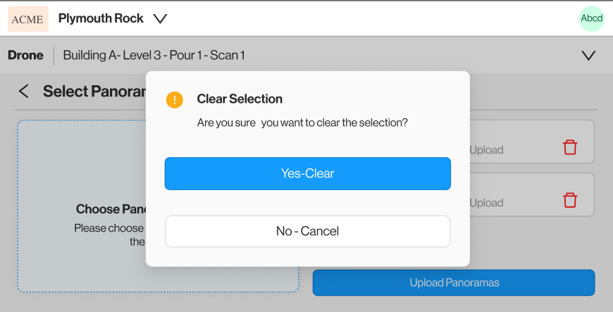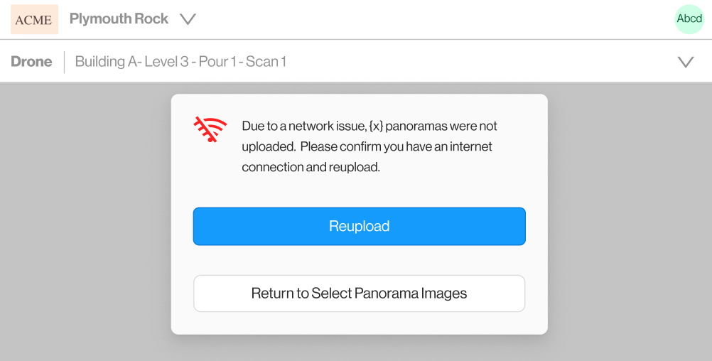 If, due to a poor internet connection some of the panoramas are not uploaded, the following message will appear.Clicking Reupload will reattempt to upload all failed panoramas.