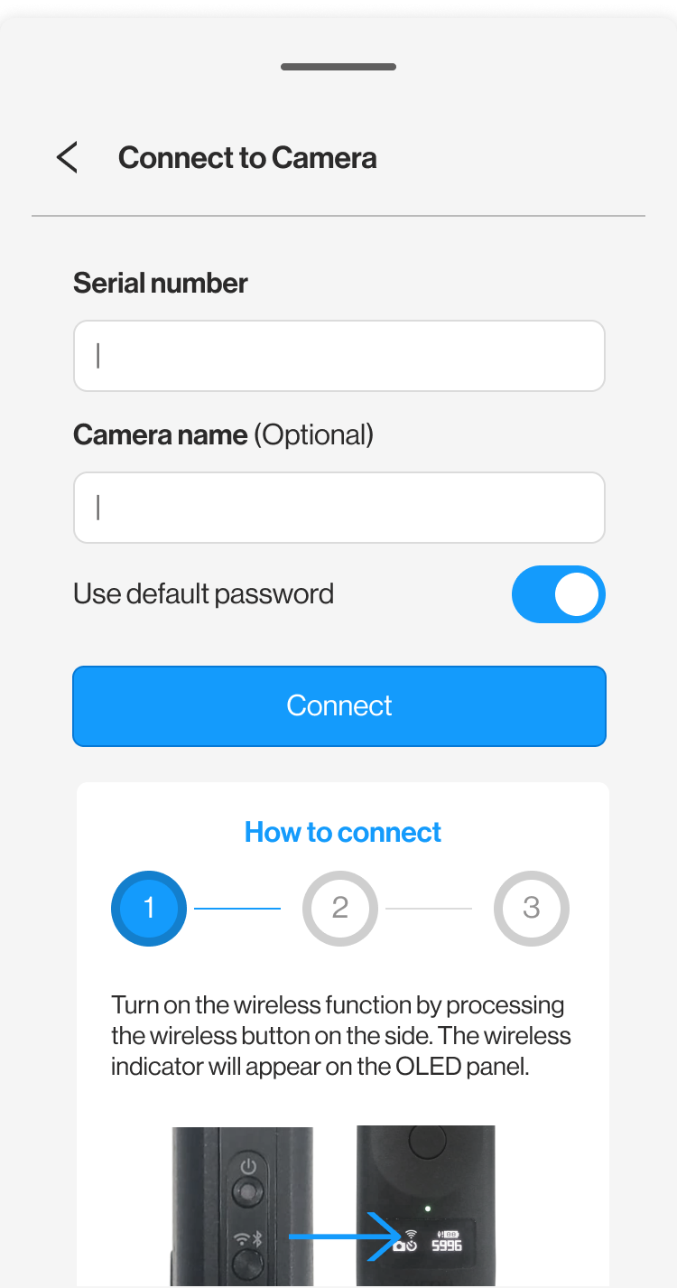 To connect your camera for the first time, follow the steps in the 'How to Connect' guide. Click Connect to pair your device with the camera. |