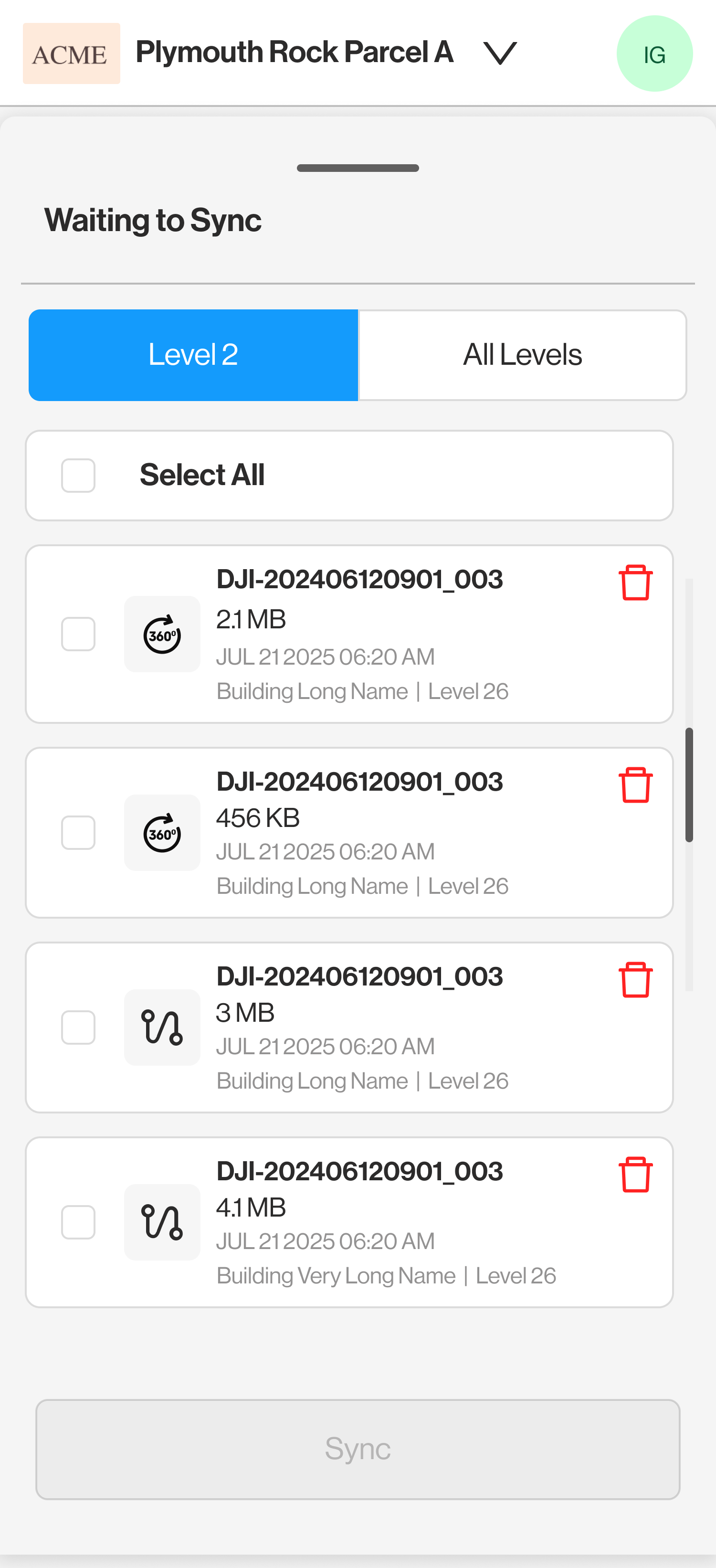 After completing any capture, the data will be sent to the Sync List for uploading. The sync list can be accessed by clicking on the Sync Items button or from the Avatar Menu. |