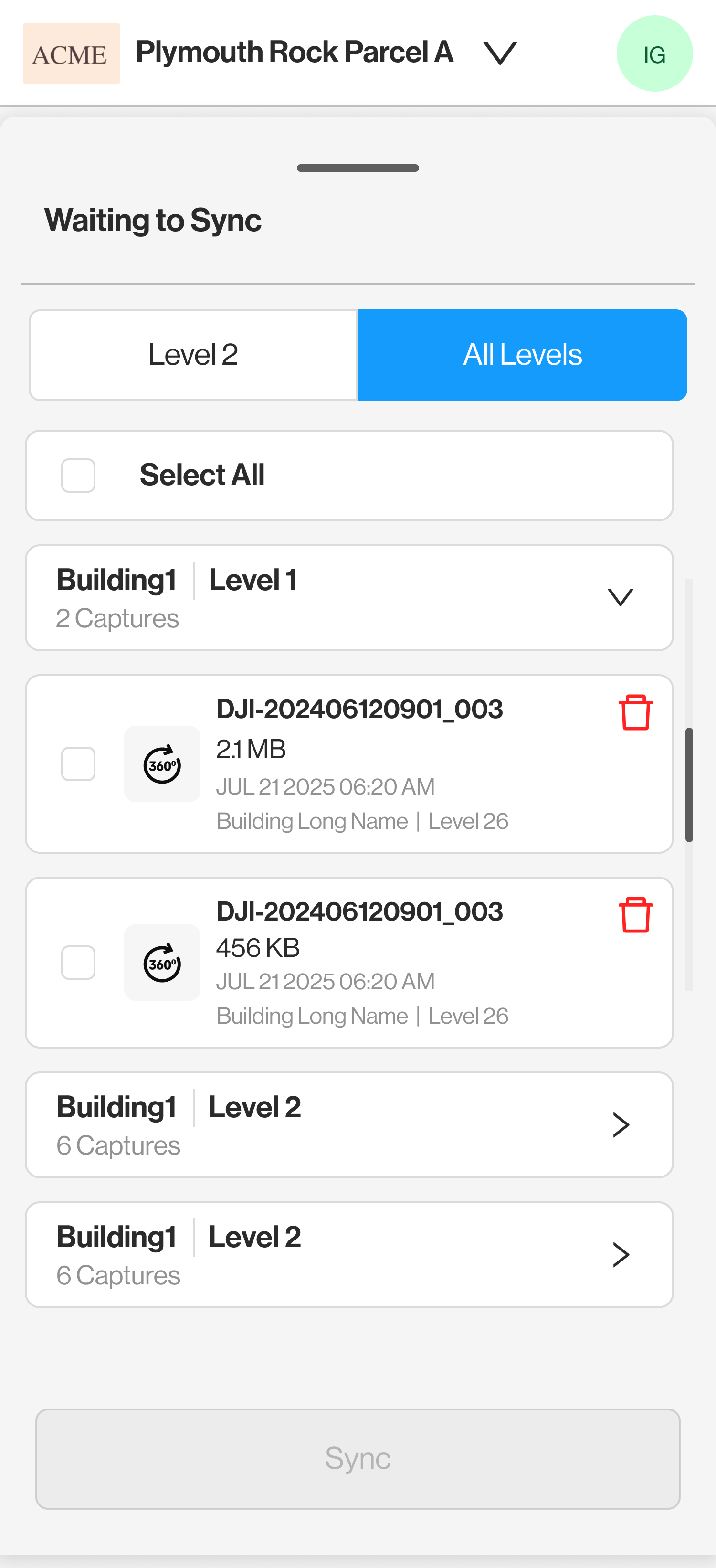 From the sync list you can choose to upload or delete any of your completed captures.
